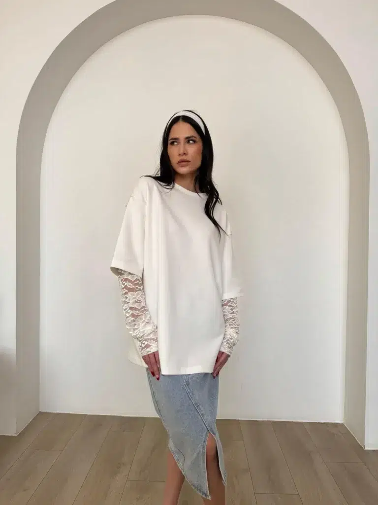 חולצת בייסיק , שרוול קצר , צווארון פולו, כתוביות מקדימה ומאחורה. מידת הבגד על הדוגמנית OS.