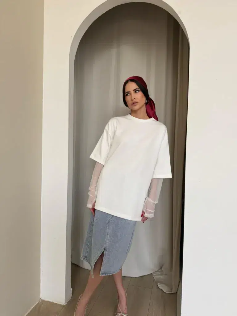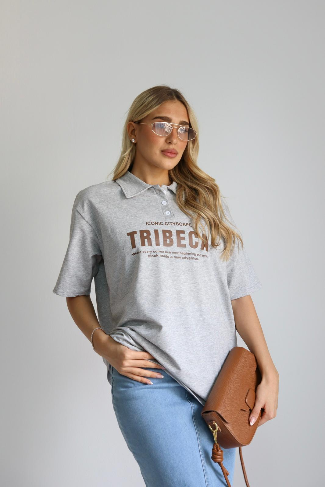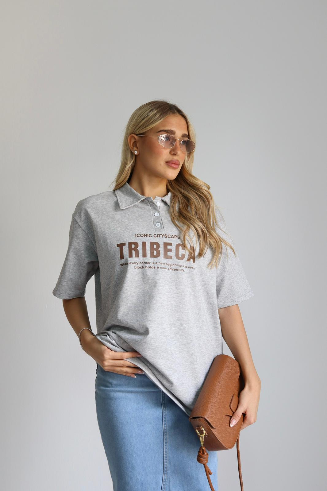 חולצת בייסיק , שרוול קצר , צווארון פולו, כתוביות מקדימה ומאחורה. מידת הבגד על הדוגמנית OS.