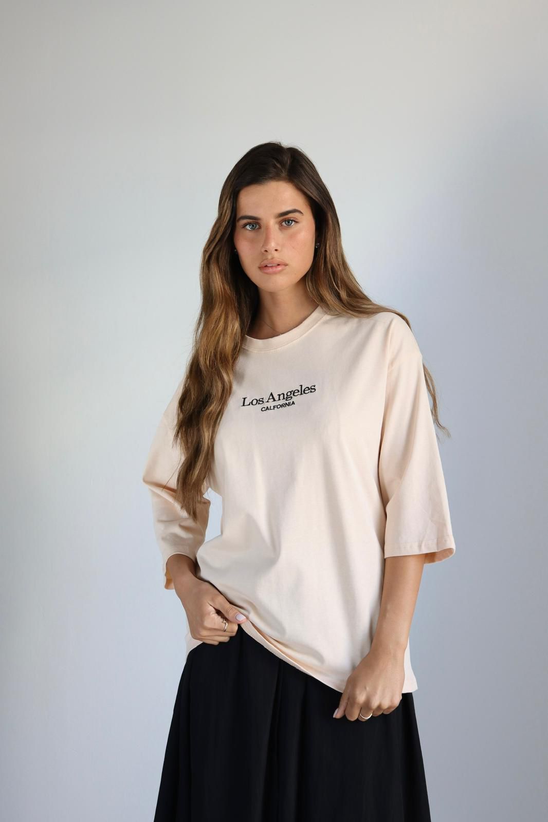 חולצה בייסיק שרוול מרפק עם הדפס. מידת הבגד על הדוגמנית וואן סייז.