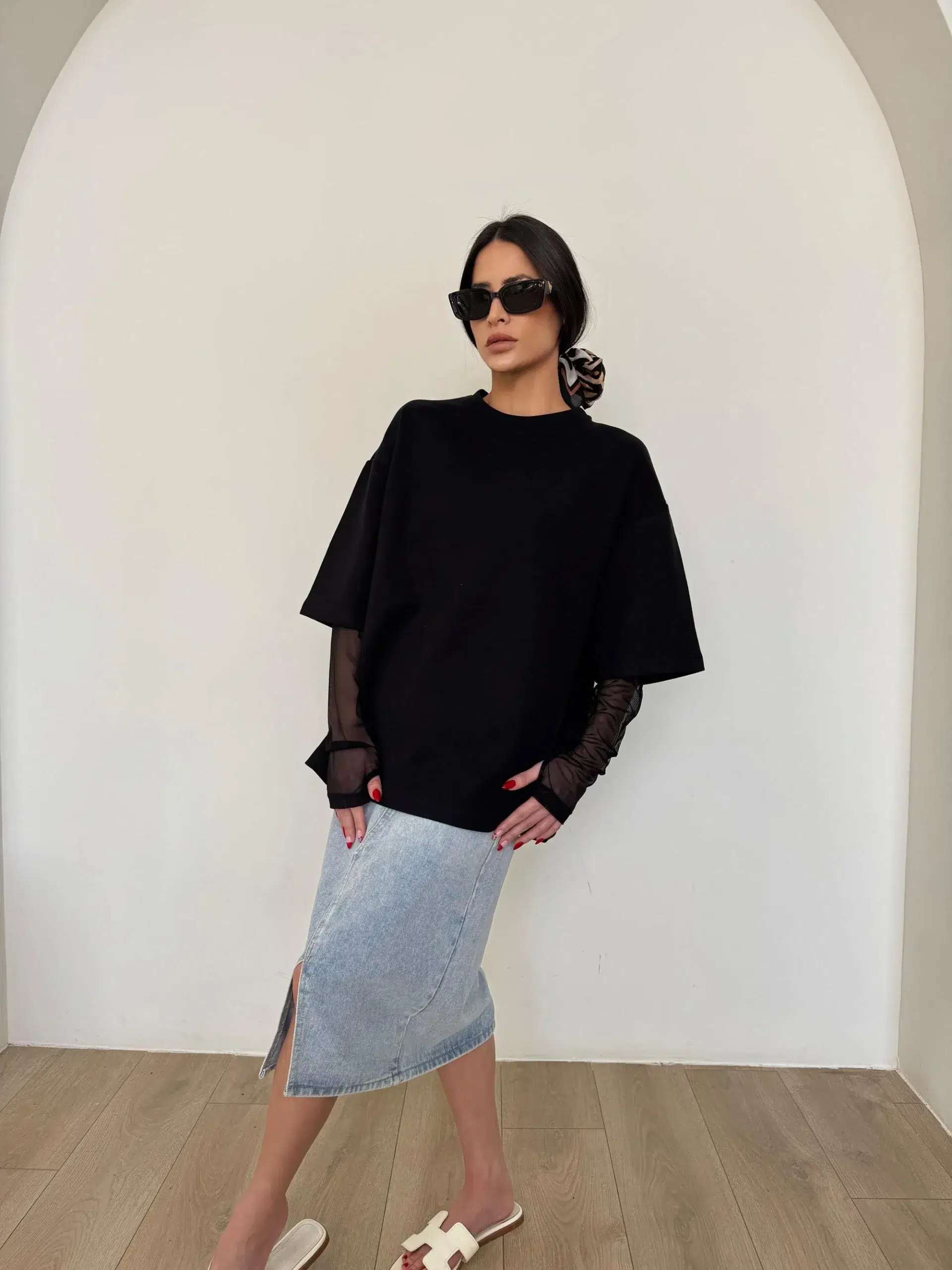 חולצה בגזרה רחבה עם שרוול כפפה מבד תחרה.