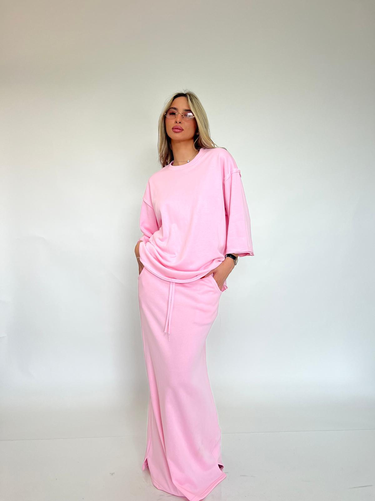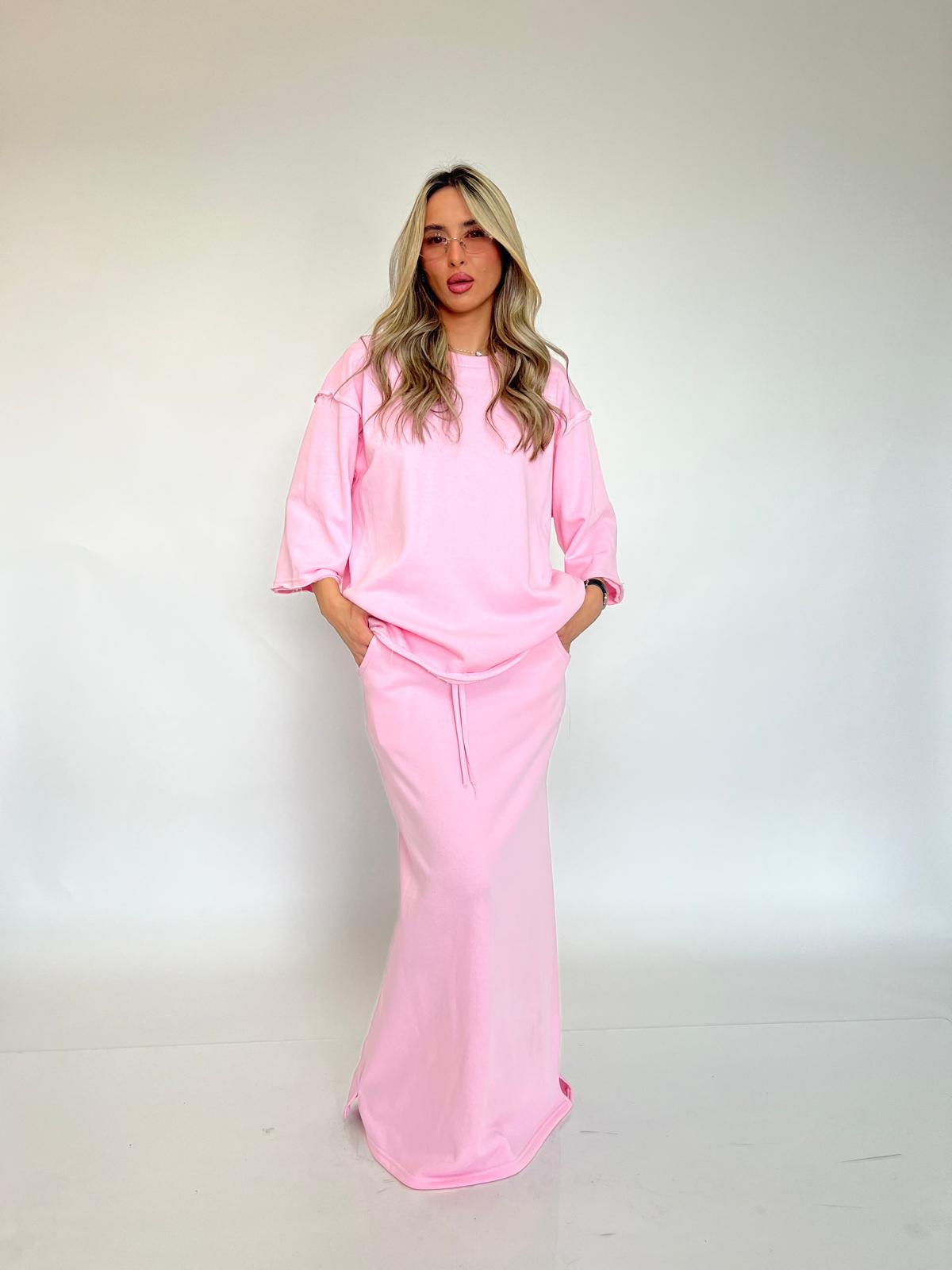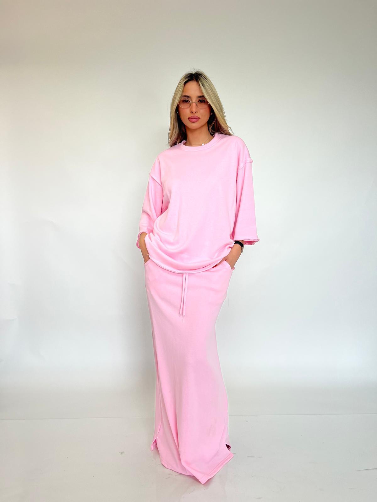 חליפת 2 חלקים מבד פרנץ טרי, חולצה שרוול מרפק, חצאית ארוכה. מידת הבגד על הדוגמנית 1.
