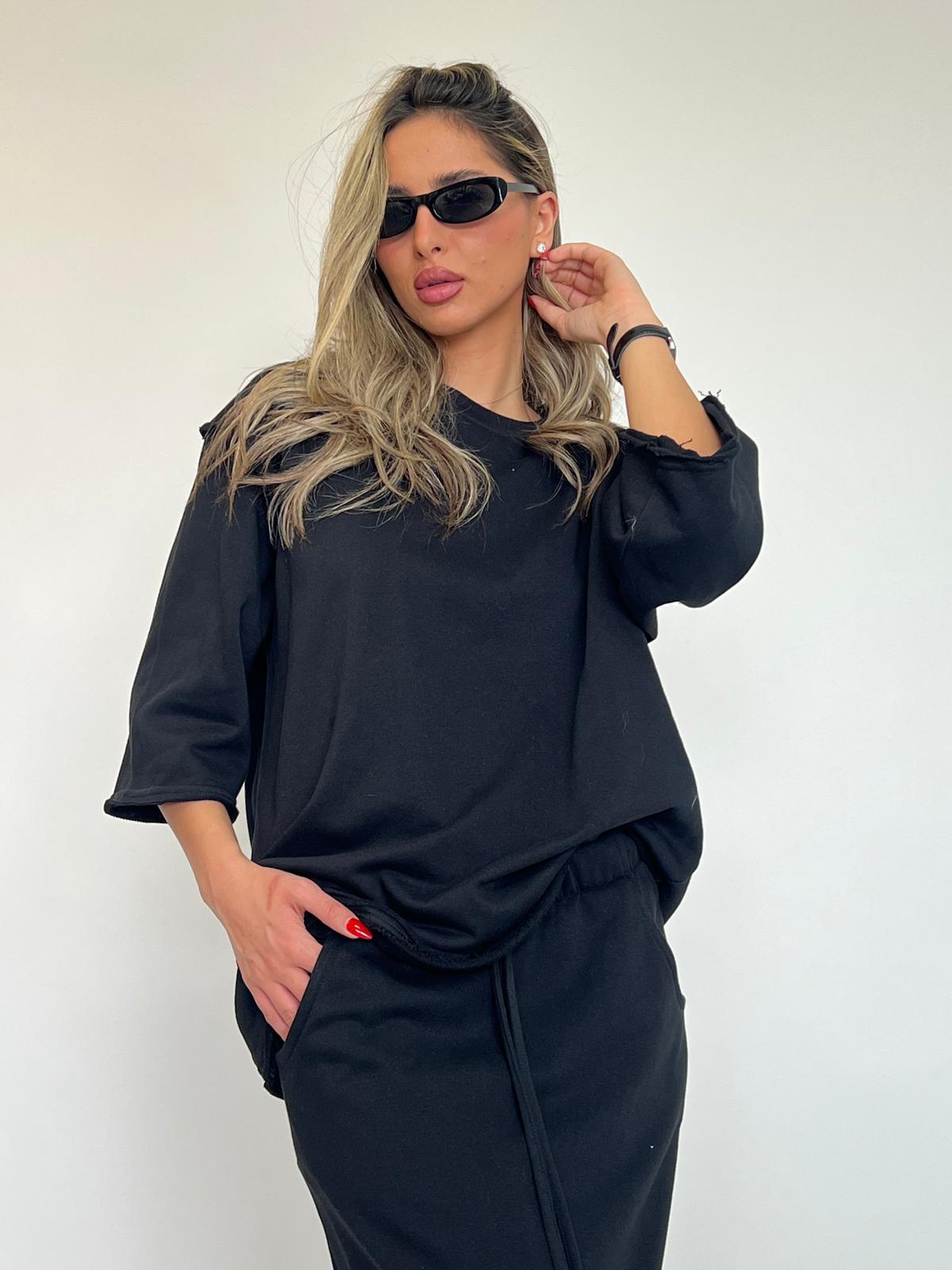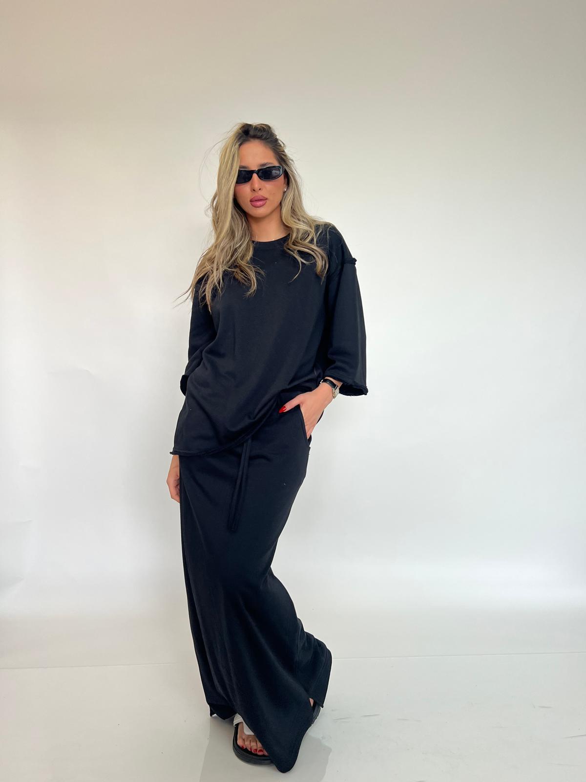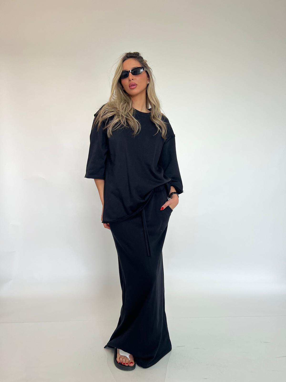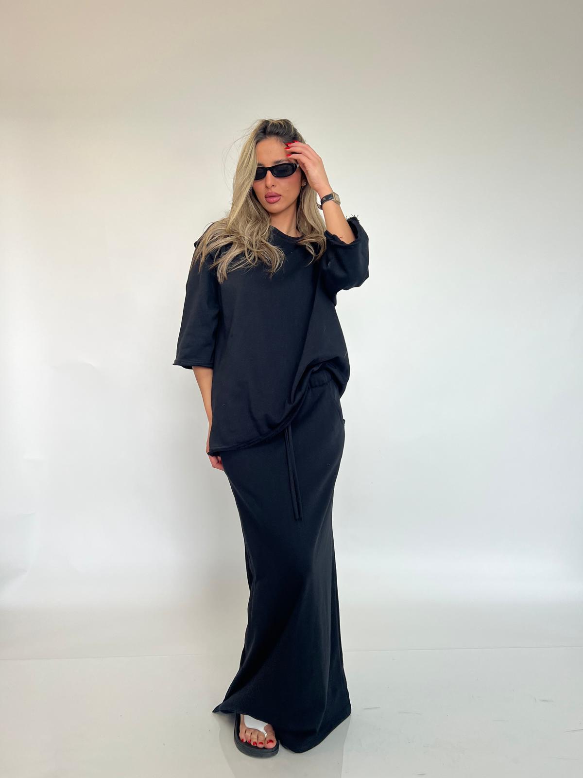 חליפת 2 חלקים מבד פרנץ טרי, חולצה שרוול מרפק, חצאית ארוכה. מידת הבגד על הדוגמנית 1.