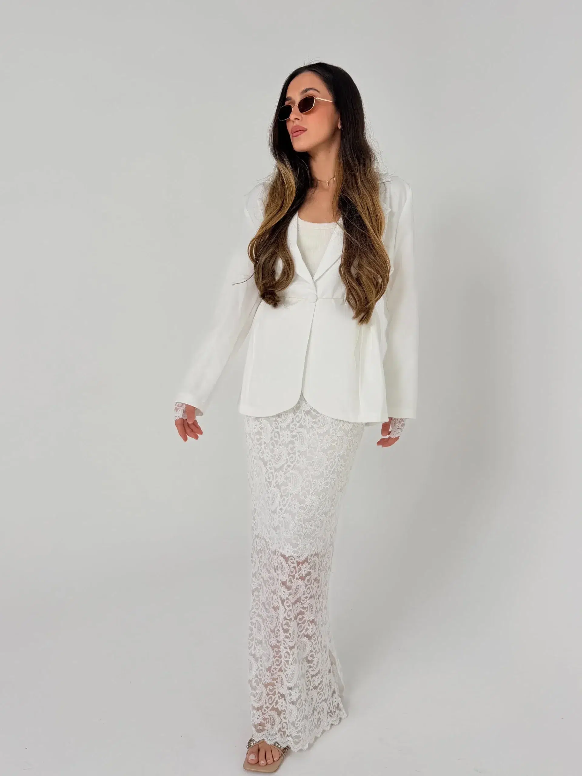 חליפת 3 חלקים, בלייזר אלגנט, חצאית תחרה ארוכה עם בטנה, חוטלות לידיים.
