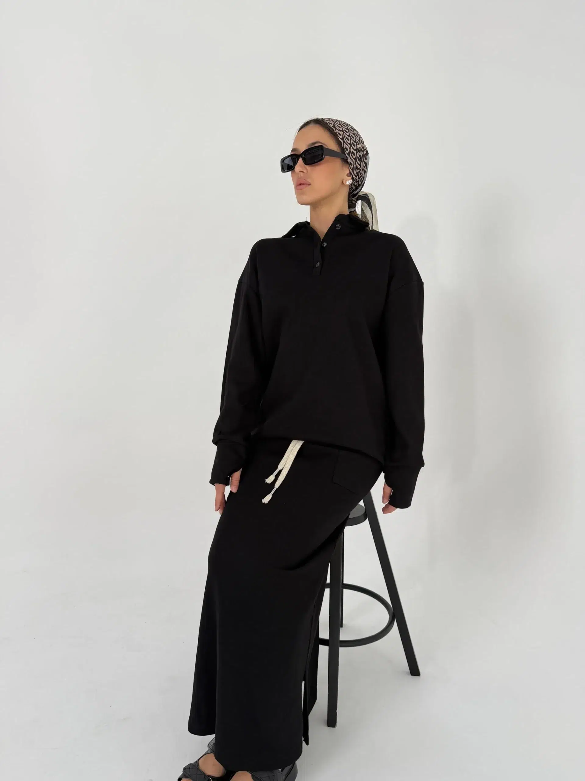 חליפת שני חלקים, חולצה צווארון וי וחצאית בגזרה ישרה עם שרוך.