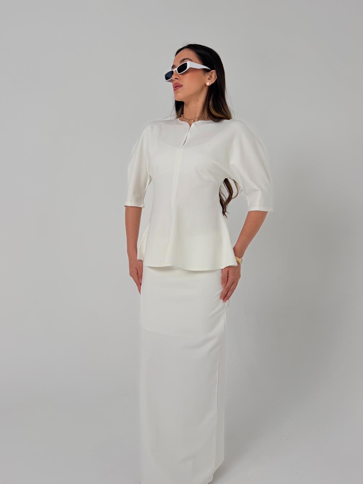 חליפת 2 חלקים מבד ג׳רסי, בד מחטב מושלם, חצאית מתרחבת. מידת הבגד על הדוגמנית 1.