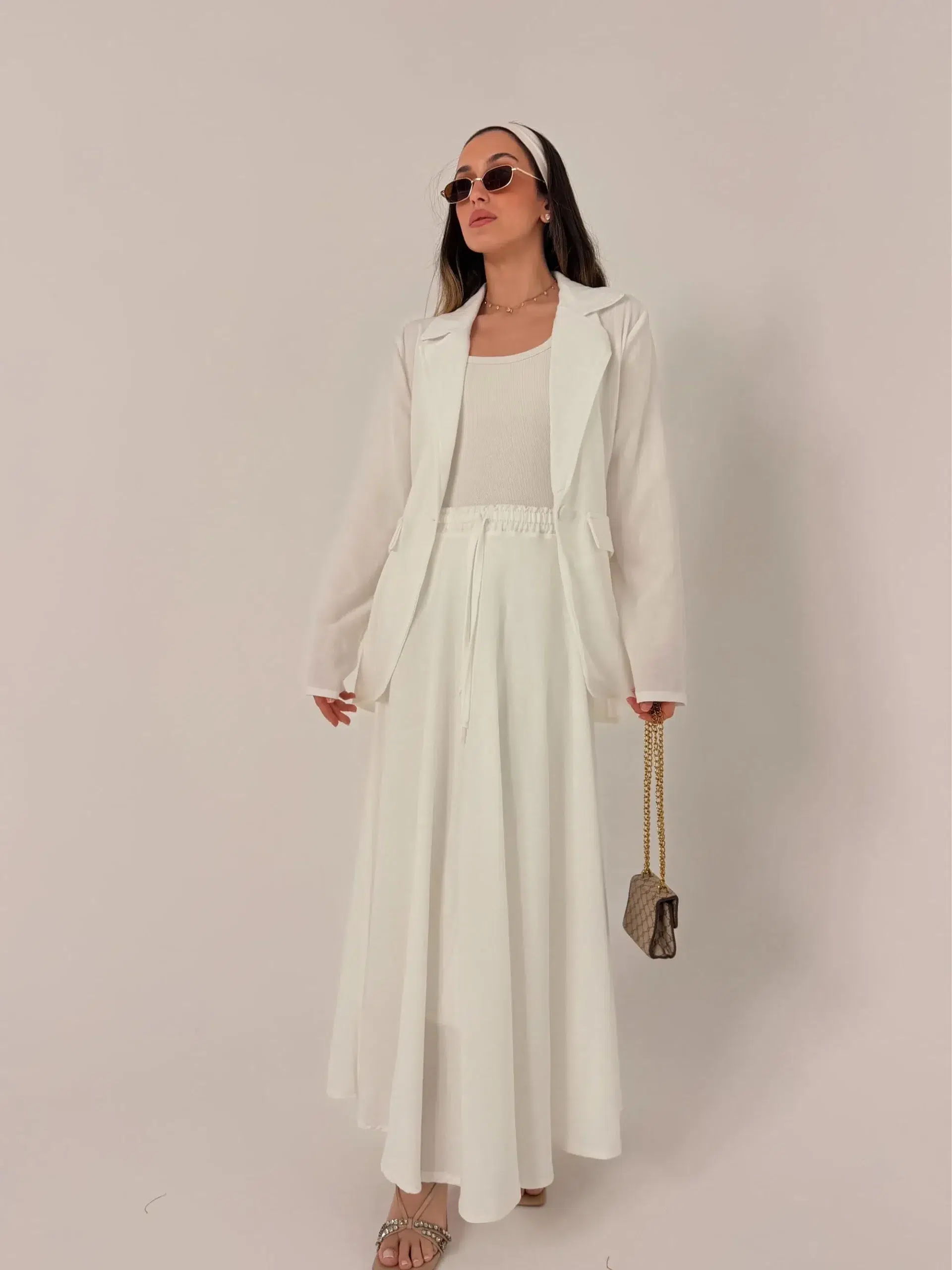 חליפת 2 חלקים, בלייזר וחצאית קלושית ארוכה ללא שסעים עם גומי במותן.