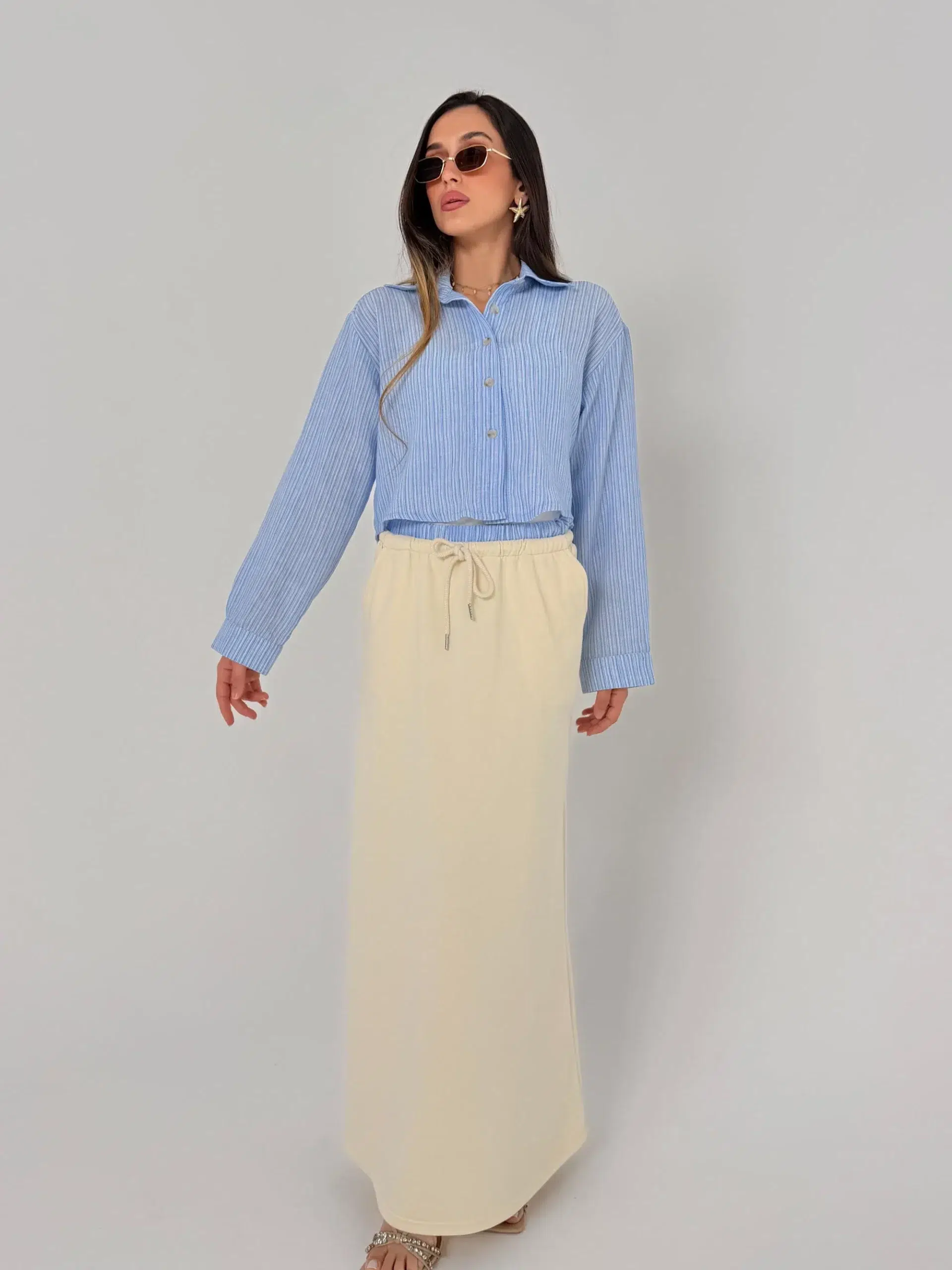 חליפת 2 חלקים, מכופתרת וחצאית ארוכה עם גומי.