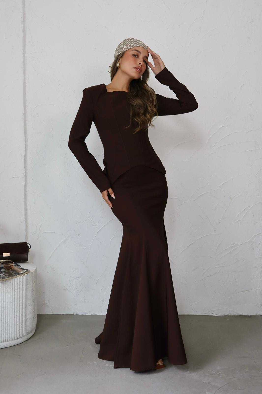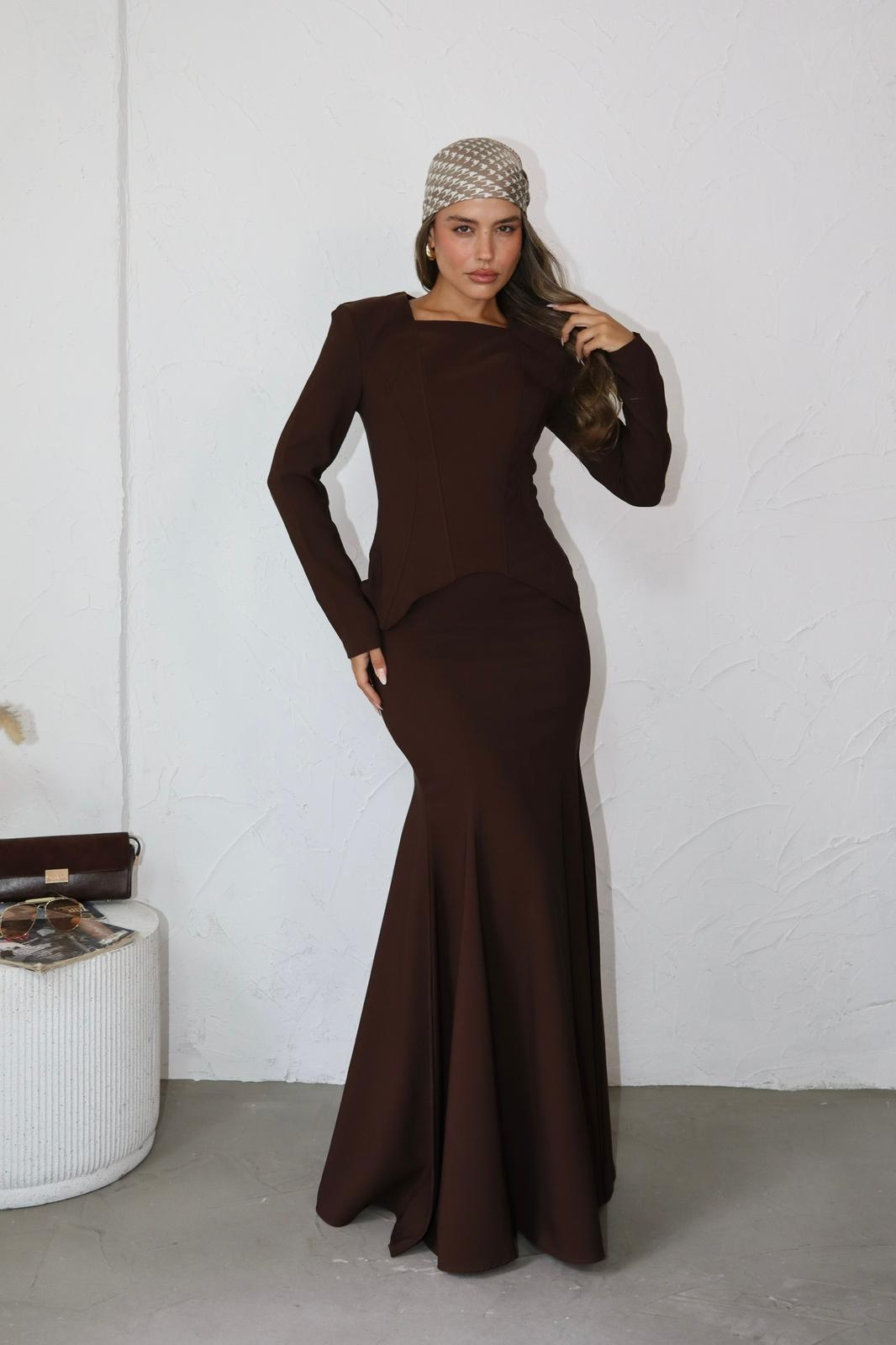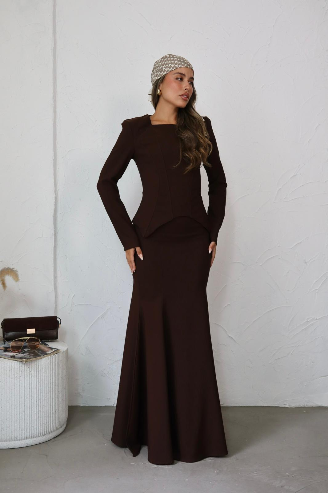 חליפת 2 חלקים , מחוץ עם עצמות ורוכסן, חצאית מקסית קלושית. מידת הבגד על הדוגמנית 0.
