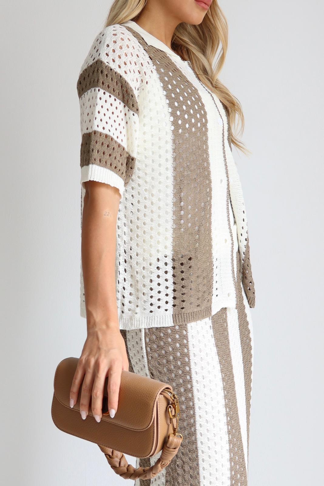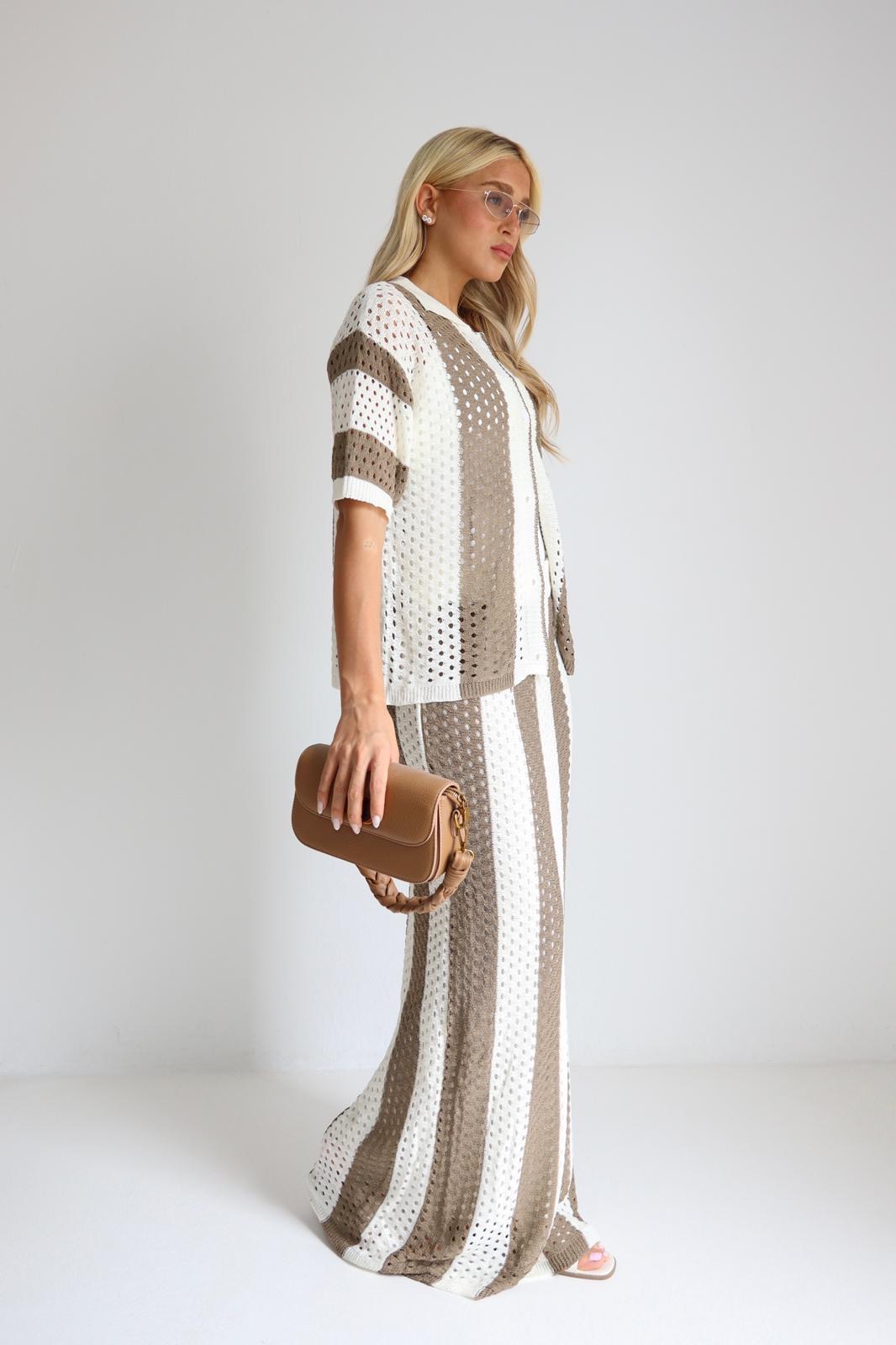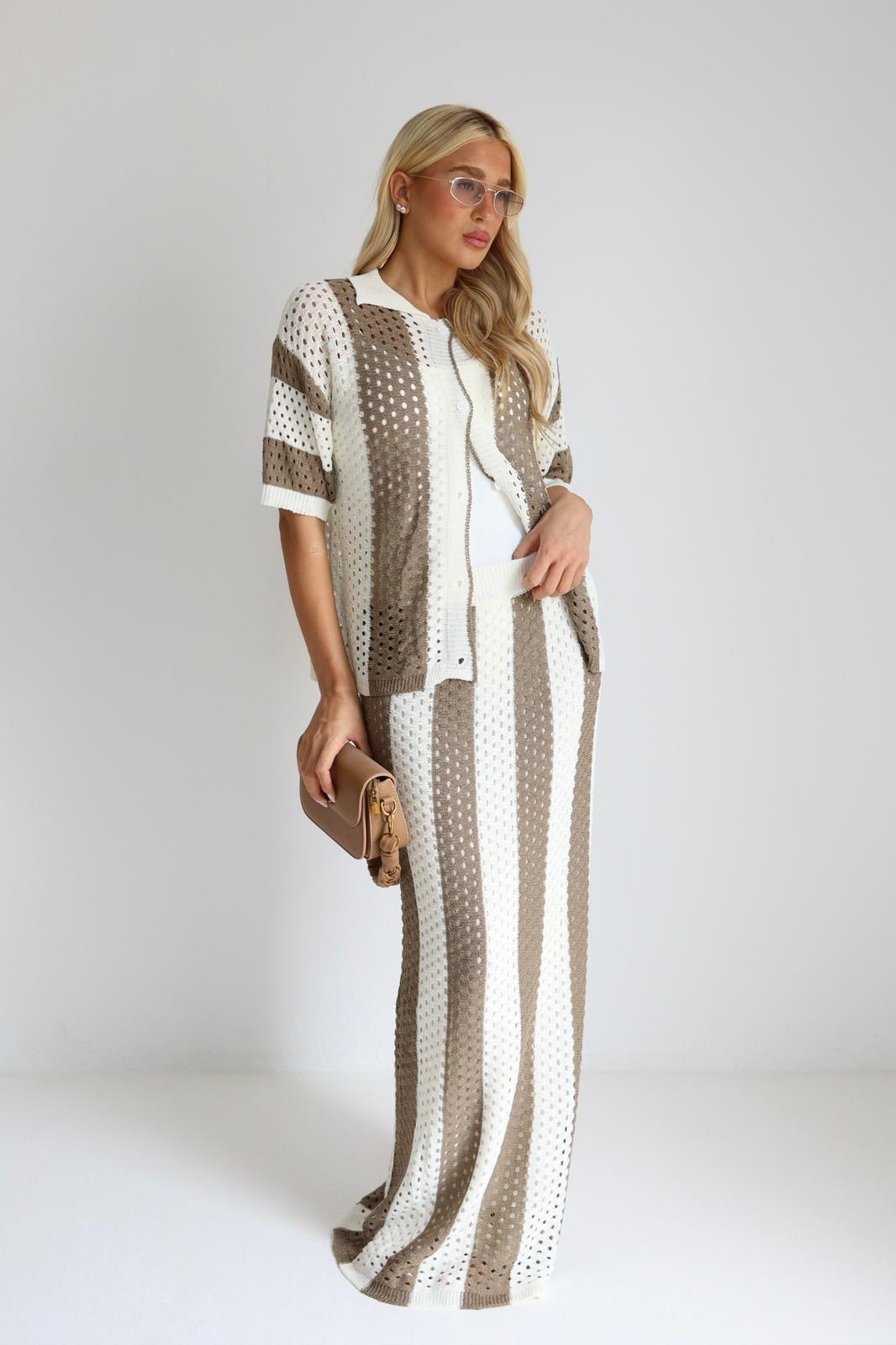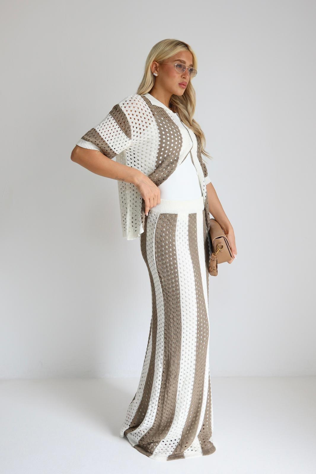 חליפת 2 חלקים סרוגה, עליונית וחצאית ארוכה. מידת הבגד על הדוגמנית וואן סייז.