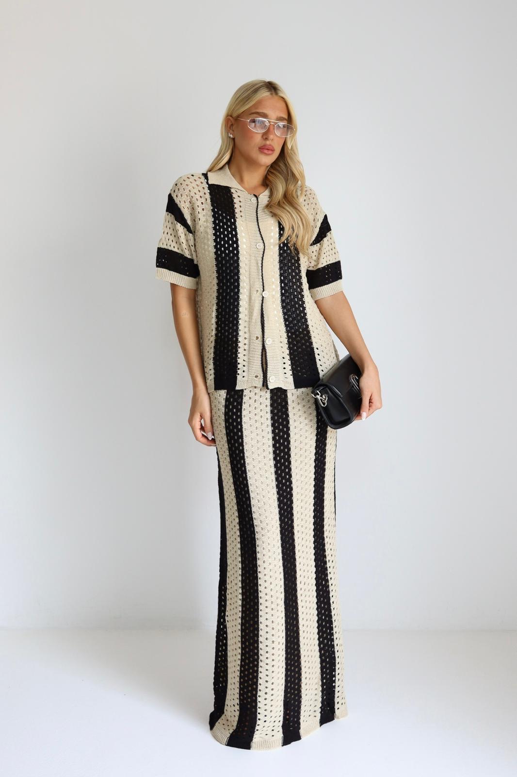 חליפת 2 חלקים סרוגה, עליונית וחצאית ארוכה. מידת הבגד על הדוגמנית וואן סייז.