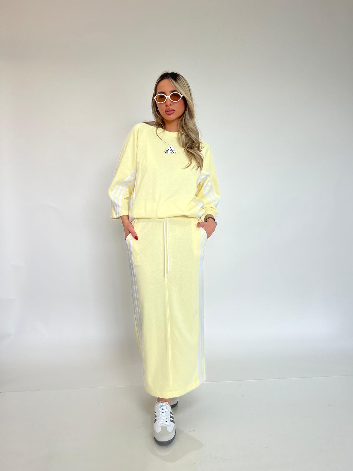 חליפת 2 חלקים , בייסיקית ושימושית. חולצה עם שרוול באורך מרפק עם סמל, חצאית ארוכה. מידת הבגד על הדוגמנית 1.