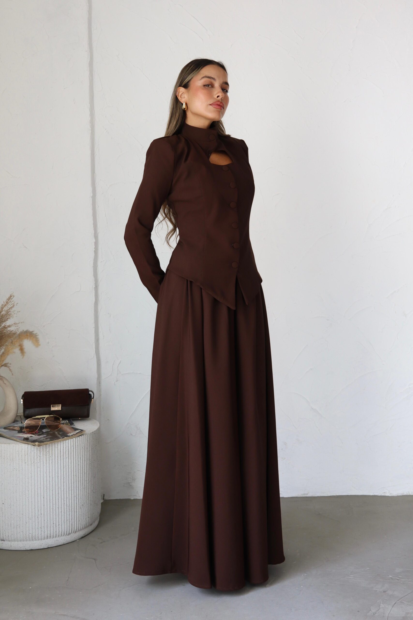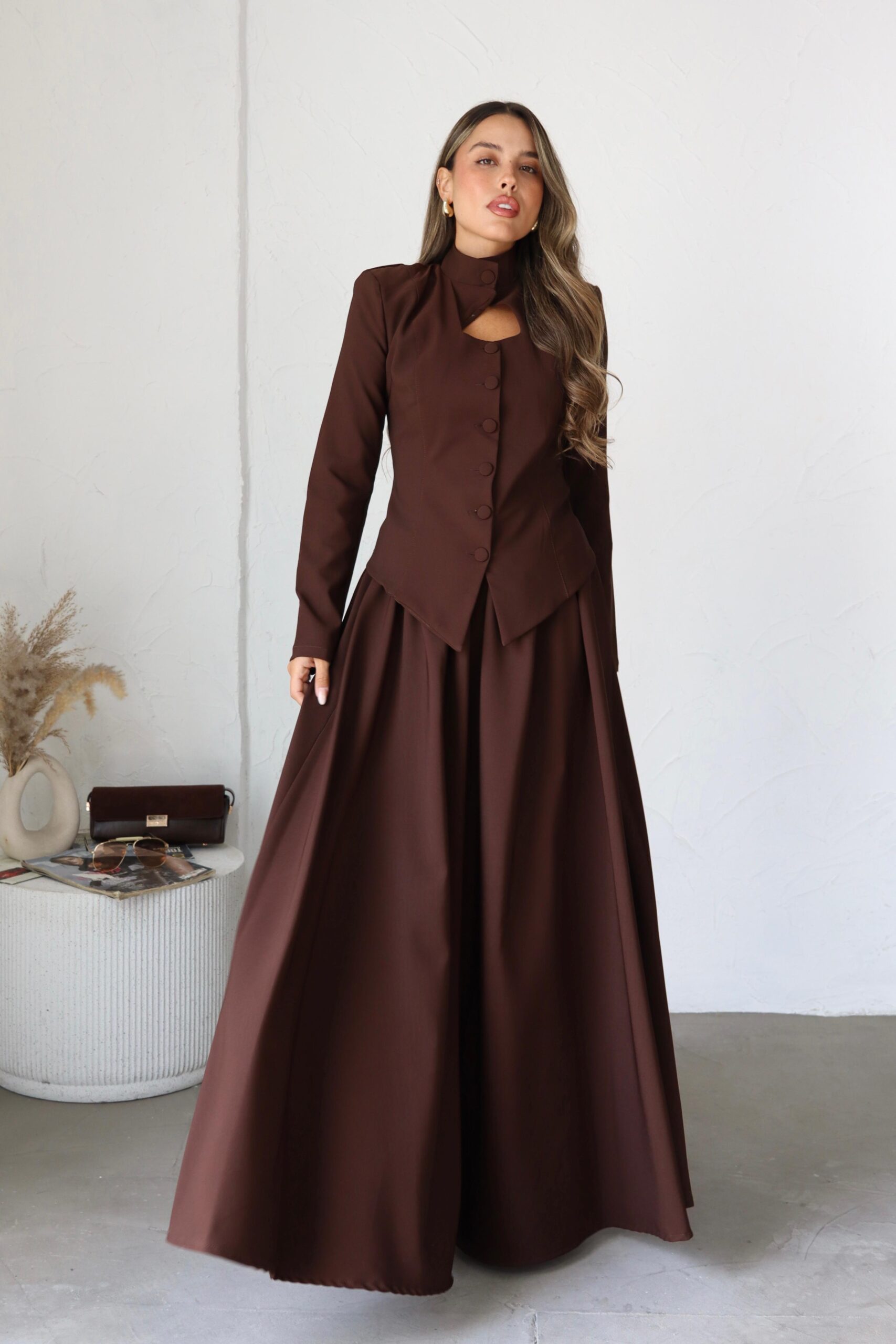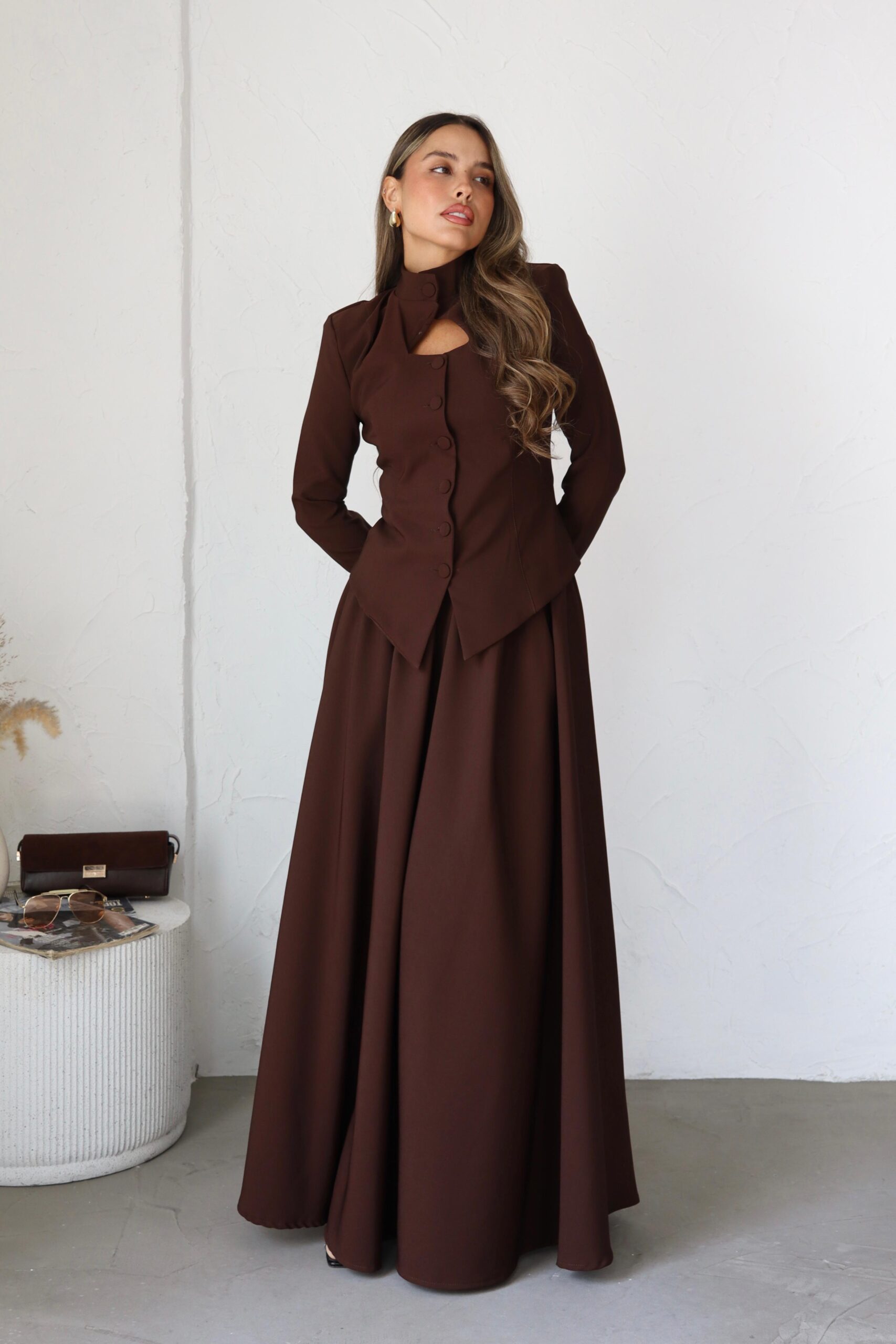 חליפת 2 חלקים, מבד אלגנטי לערב, בלייזר בגזרת מחוך עם פתח משולש וכפתורים, חצאית קלושית ארוכה. מידת הבגד על הדוגמנית 0.