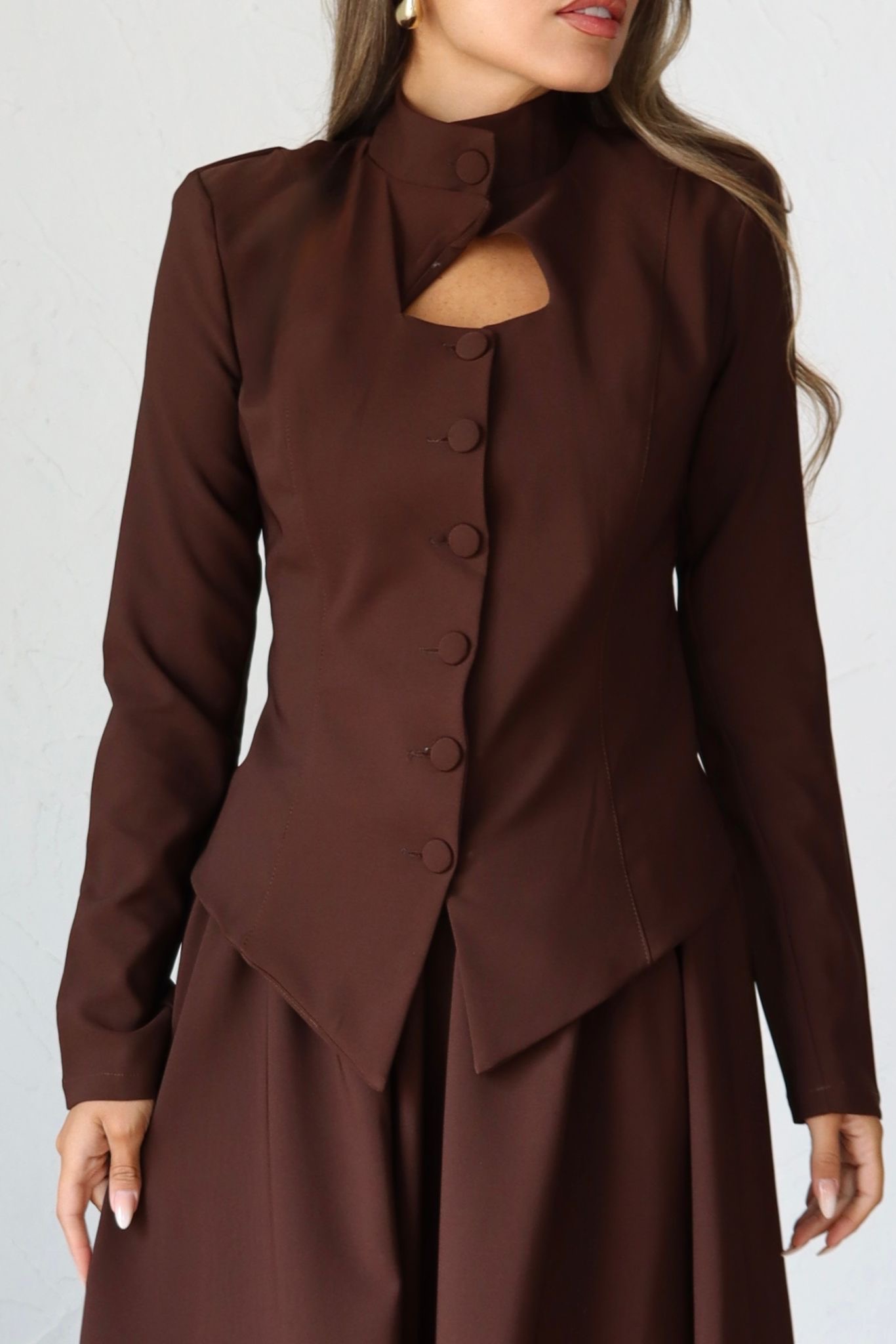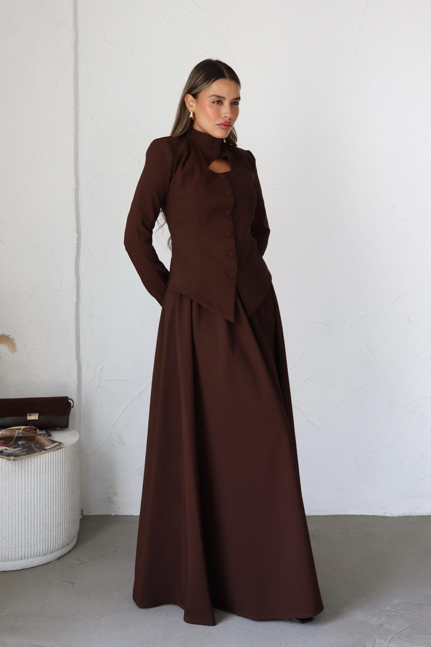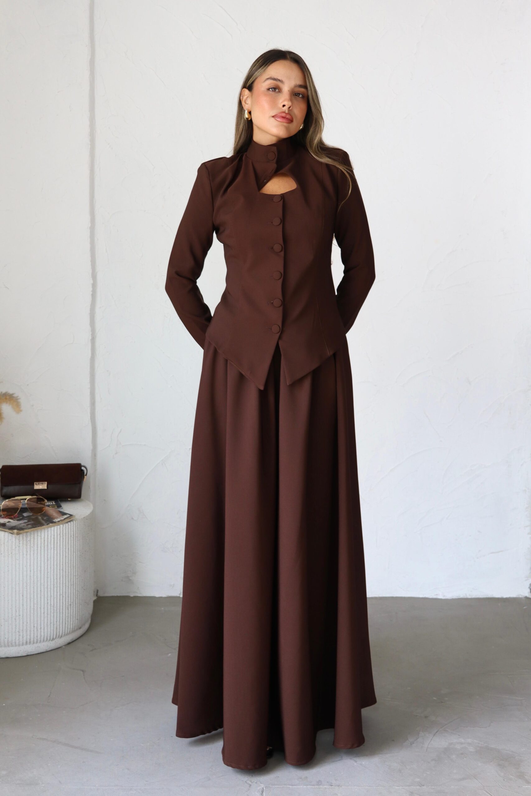חליפת 2 חלקים, מבד אלגנטי לערב, בלייזר בגזרת מחוך עם פתח משולש וכפתורים, חצאית קלושית ארוכה. מידת הבגד על הדוגמנית 0.