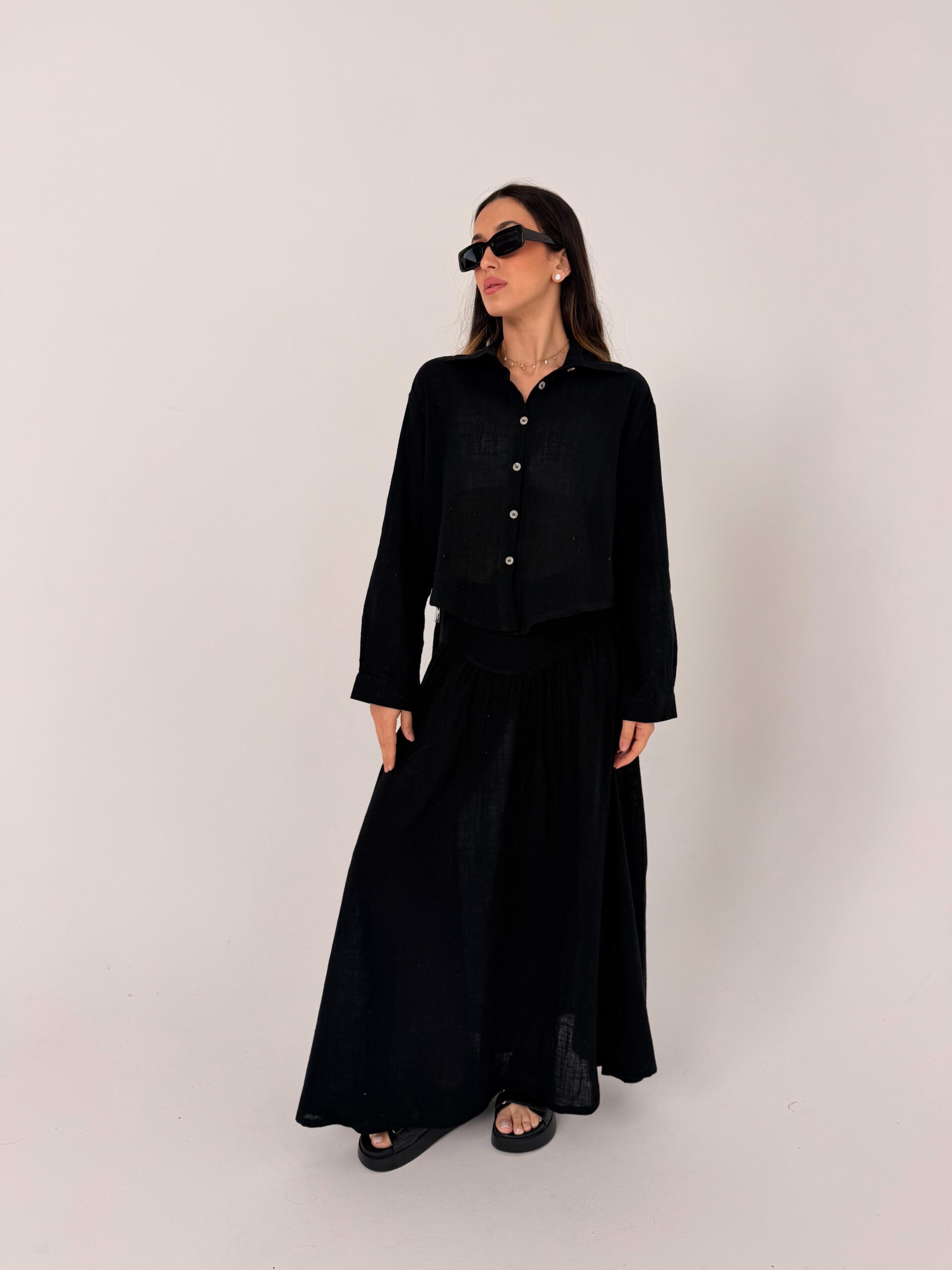 חליפת 2 חלקים מבד פשתן, חולצה מכופתרת קרופ וחצאית ארוכה עם גומי במותן. מידת הבגד על הדוגמנית 1.