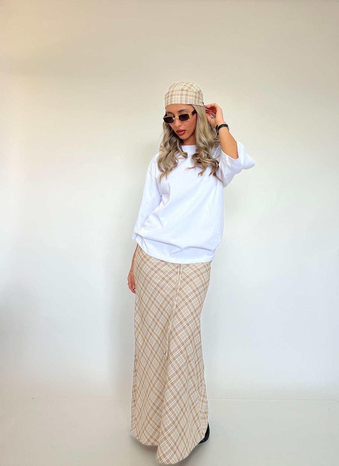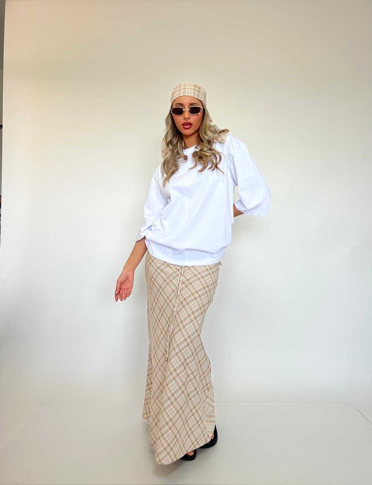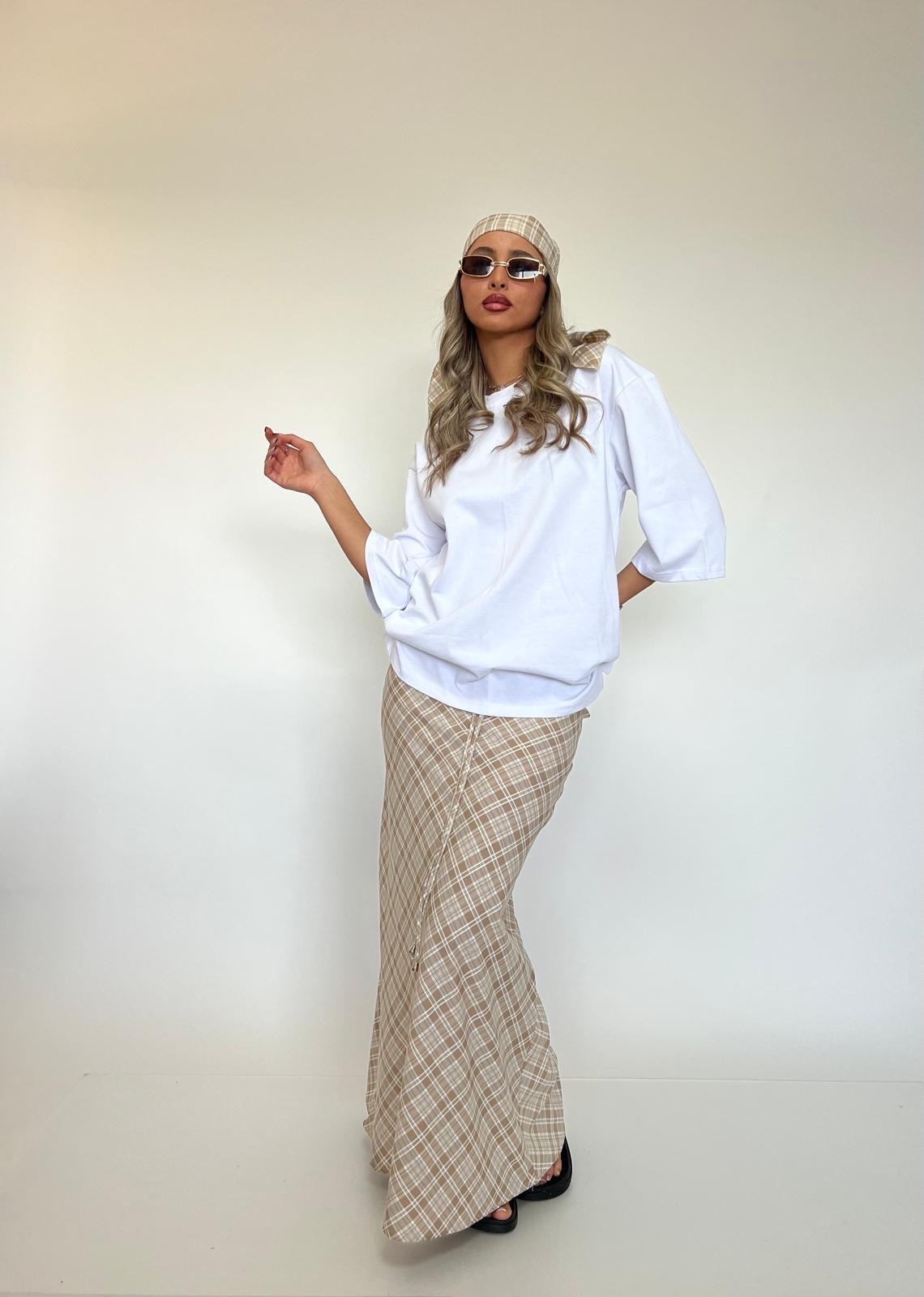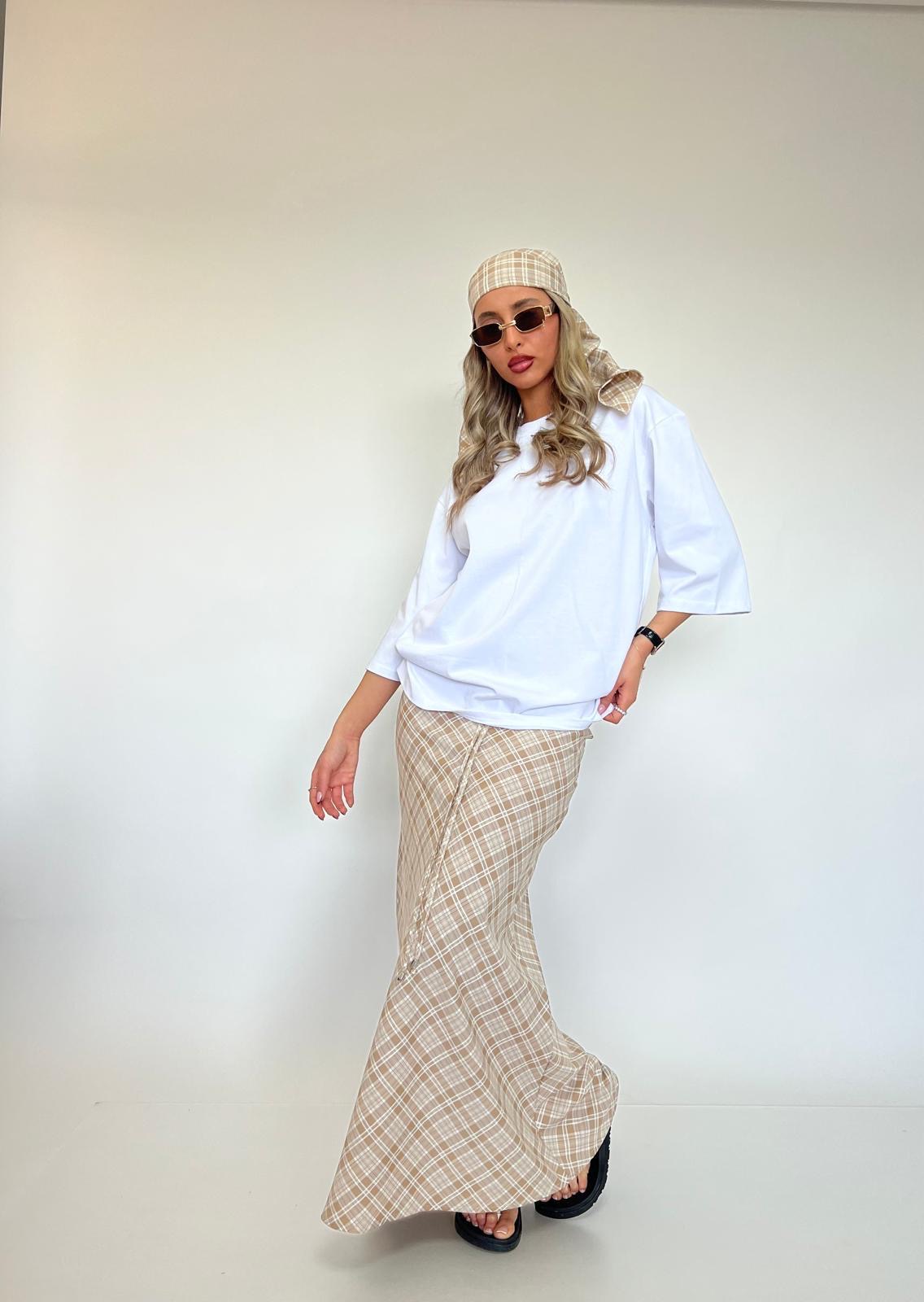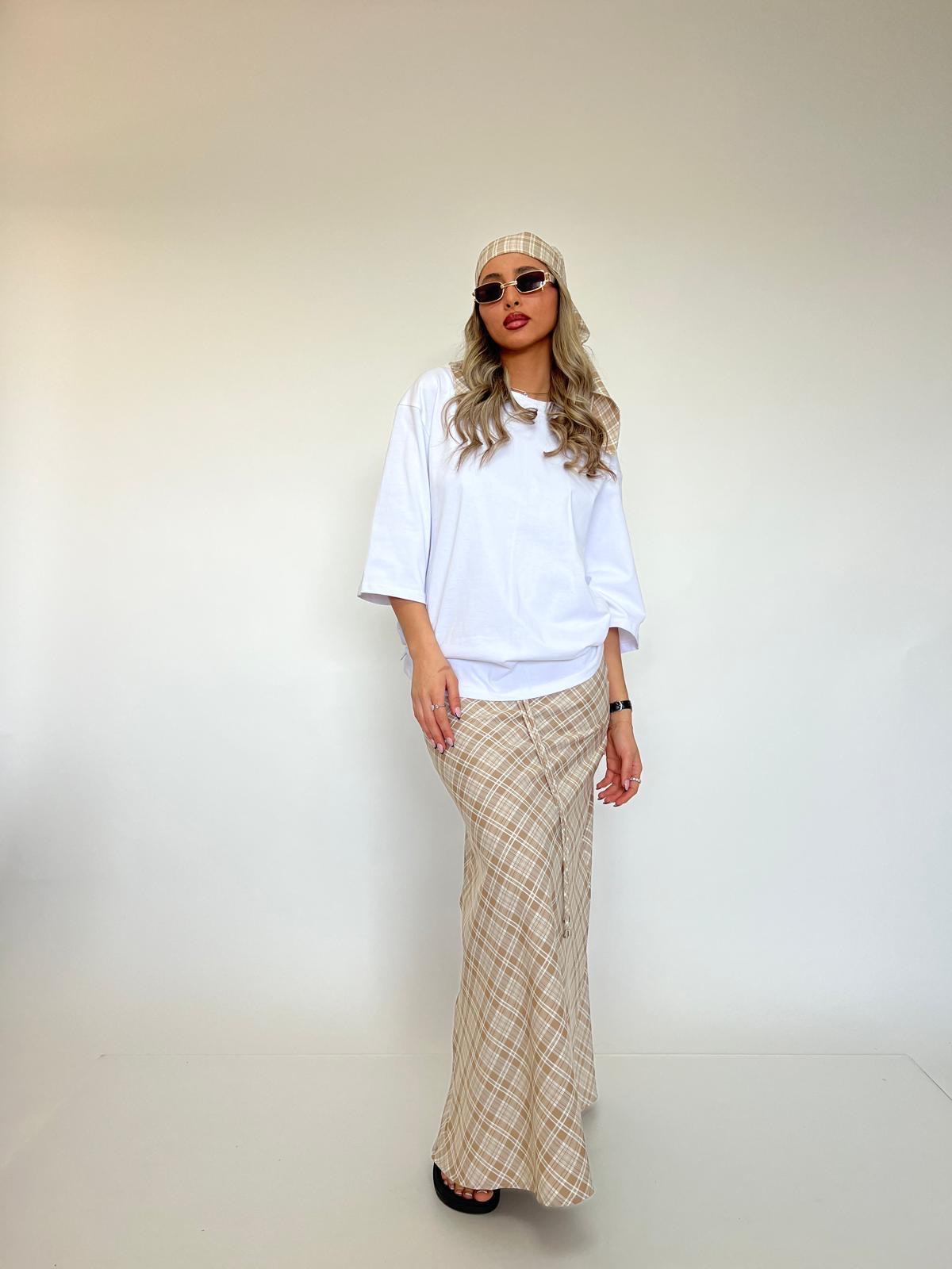 חצאית בגזרה ארוכה עם גומי ומטפחת תואמת . מידת הבגד על הדוגמנית 1.