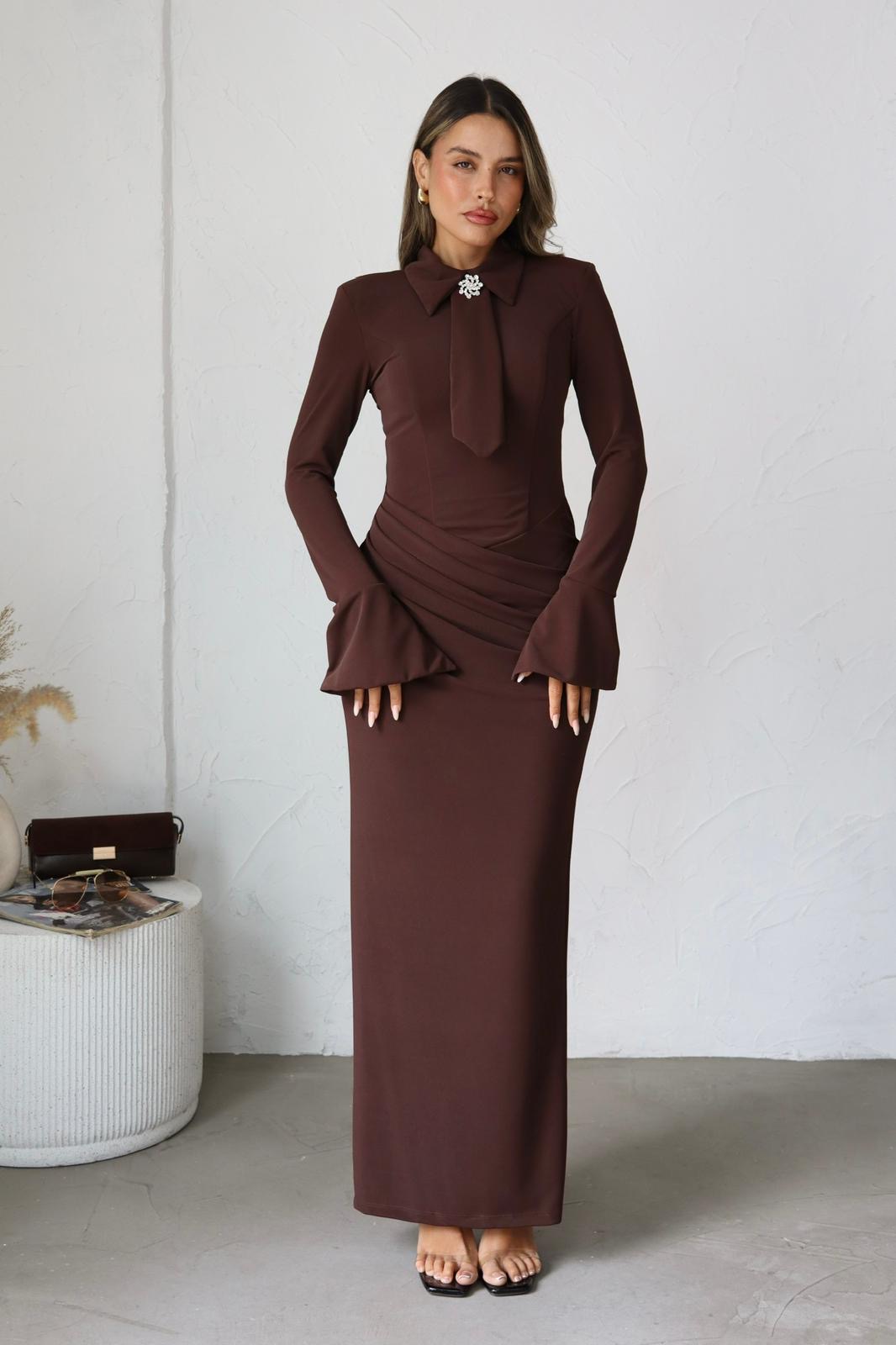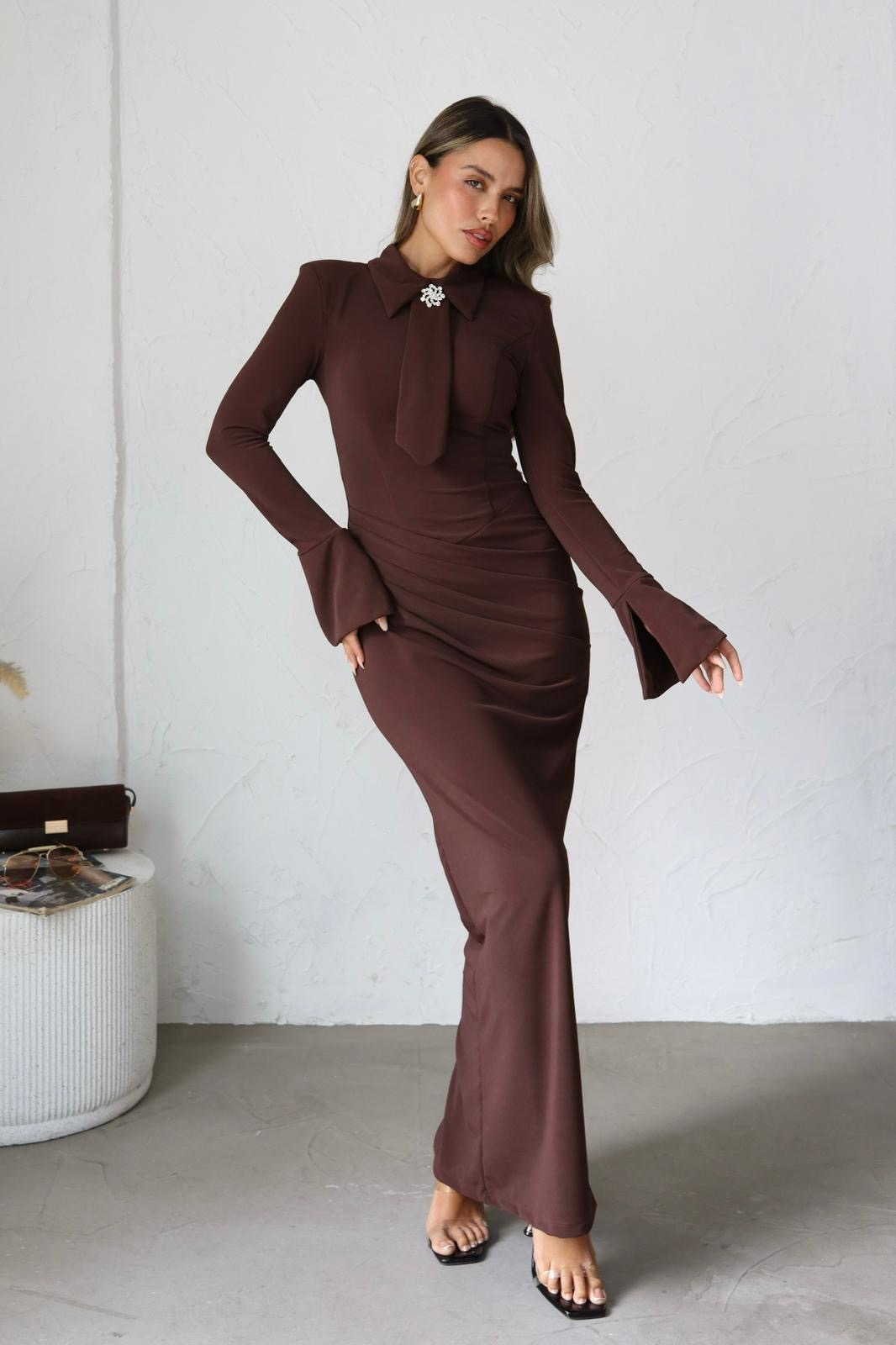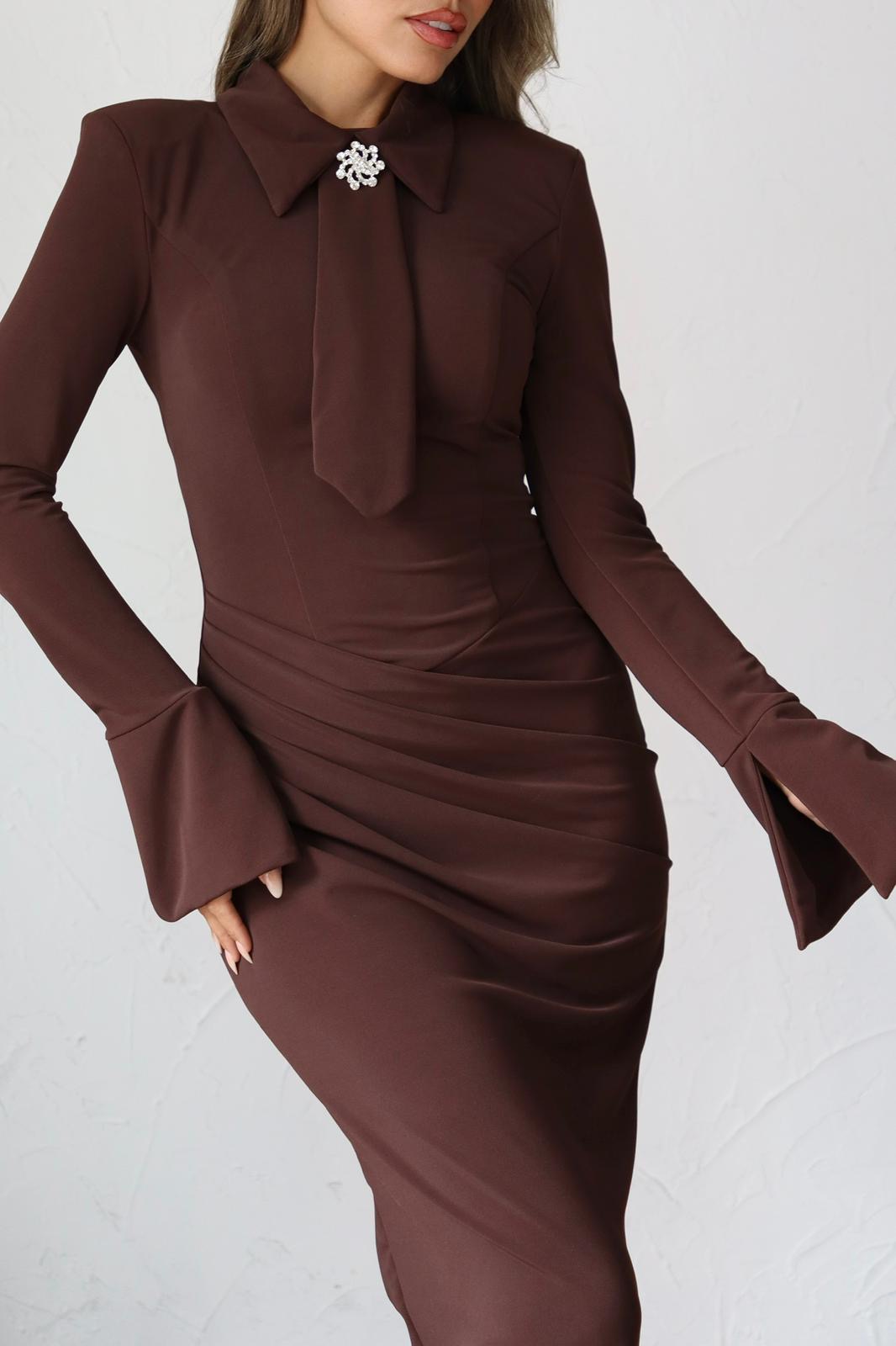 שמלת ערב משולבת לייקרה באורך מקסי, עניבה מחוברת , כיווצים במותן, שרוול מתחבר. ניתן להוציא את האבזם. מידת הבגד על הדוגמנית 0.