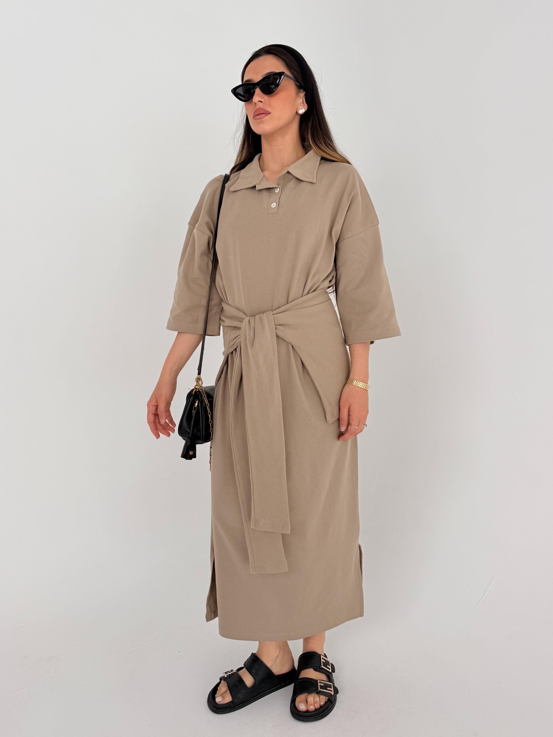 שמלת בייסיק עם צווארון פולו ארוכה, מגיעה עם בד נוסף קשירה. מידת הבגד על הדוגמנית 1.