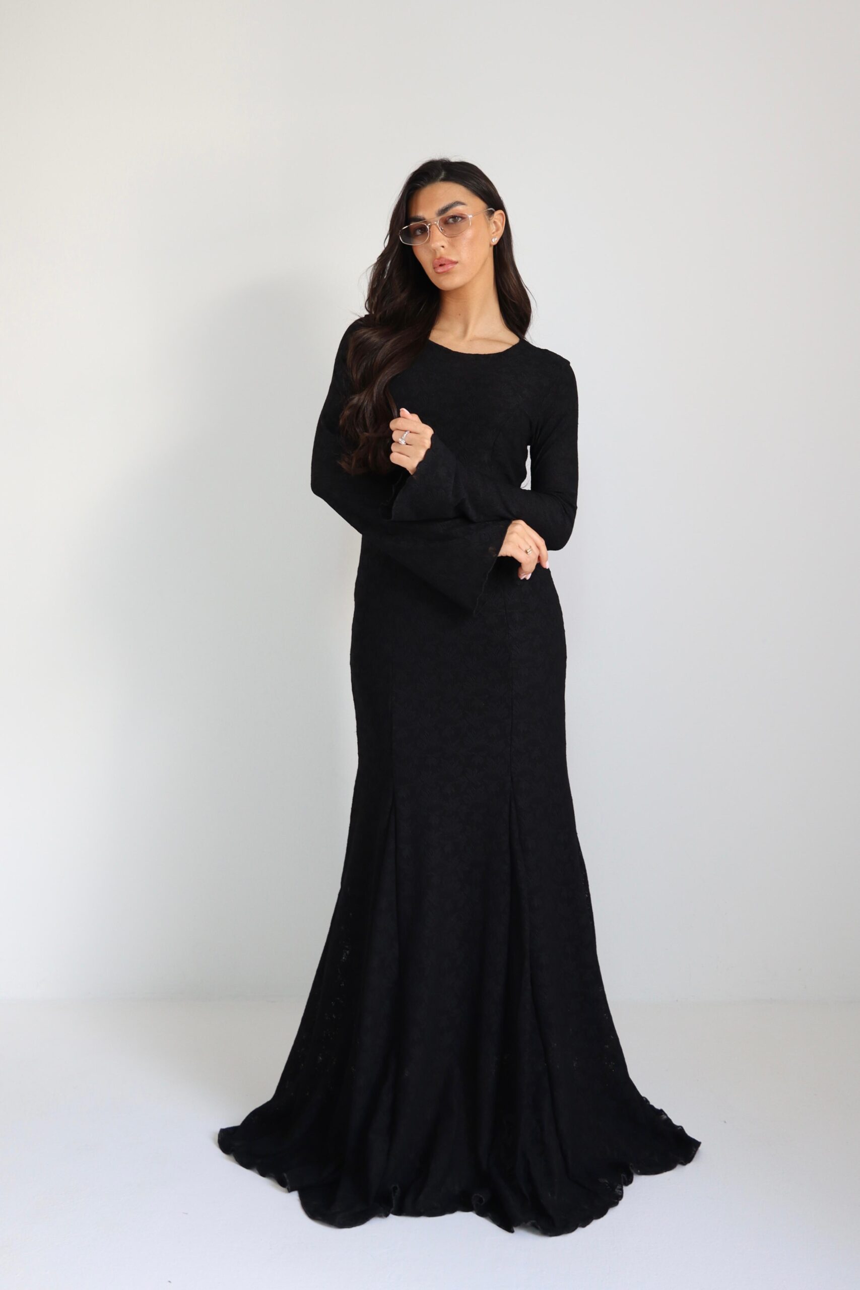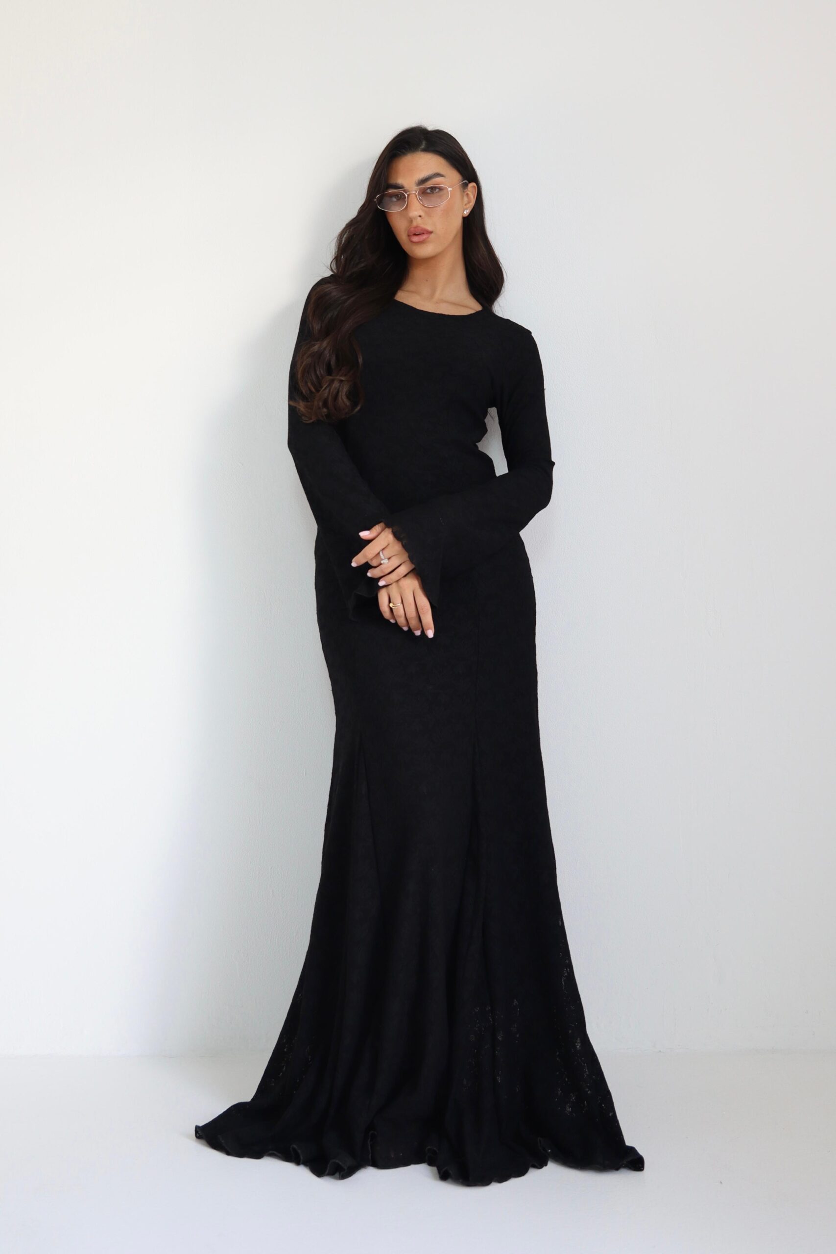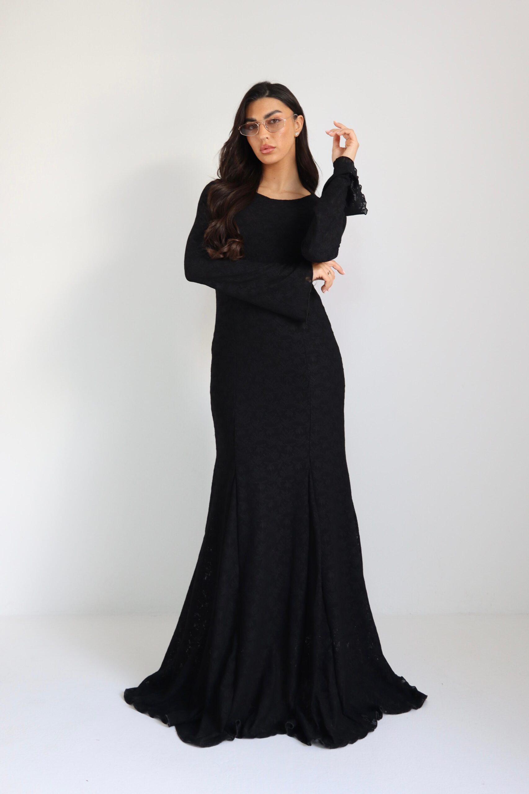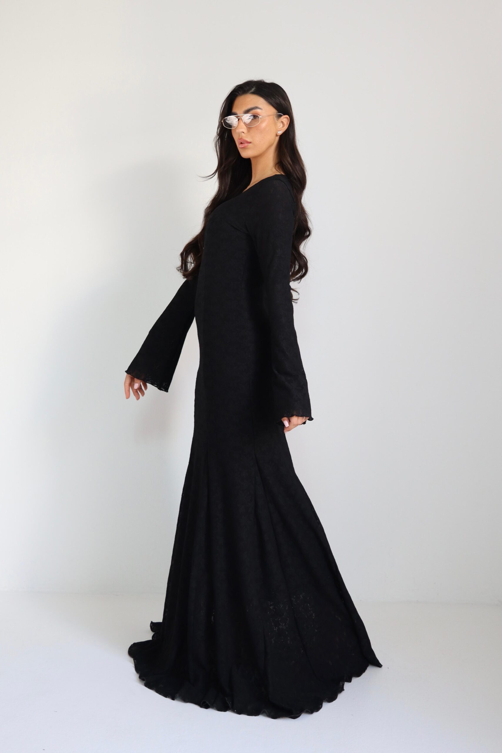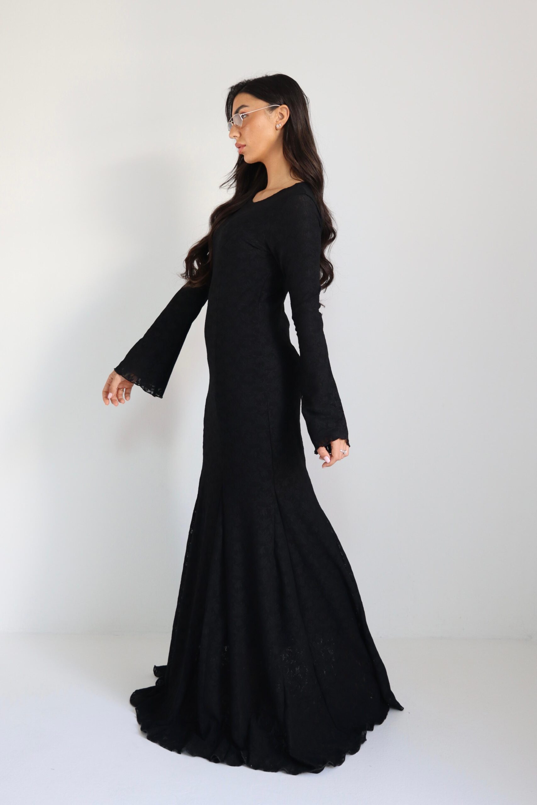שמלת תחרה ארוכה עם בטנה , סיומת קלושית. מידת הבגד על הדוגמנית וואן סייז.
